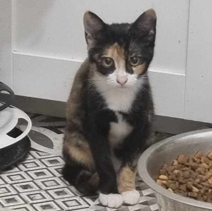 C'est une jolie minette tricolore de quatre mois. Les deux soeurs ont bien progressé depuis leur arrivée chez leur famille d'accueil et sont prêtes à rejoindre leur famille pour la vie!?