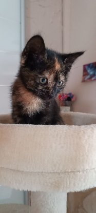 Chanel est une jolie diluée de tortue, sortie de la rue avec ses frères et soeurs. Elle est douce joueuse et câline.