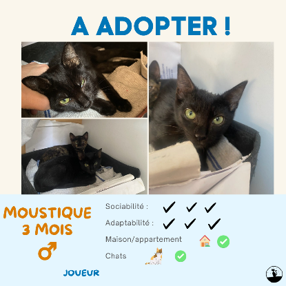 Moustique est très accordé à sa soeur Neunoeil. Il a un caractère très doux et c’est agréable au quotidien. C’est un petit bout de chat qui a envie de tisser des liens très forts avec ses humains !