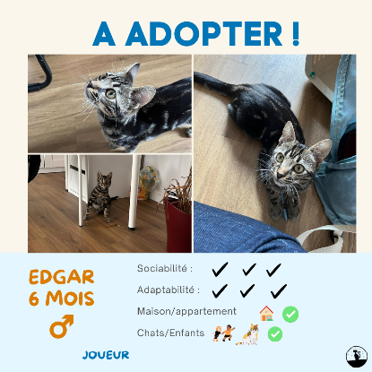 Pour Edgar nous cherchons une famille en maison. Au vu de son énergie, Edgar aura besoin de beaucoup d’espace pour être parfaitement épanoui. Edgar adorera vivre avec des enfants, mais aussi avec ses congénères chats. Enfin, Edgar sera malheureux si il est seul trop souvent à la maison. C’est un chaton qui a besoin de beaucoup d’attention.