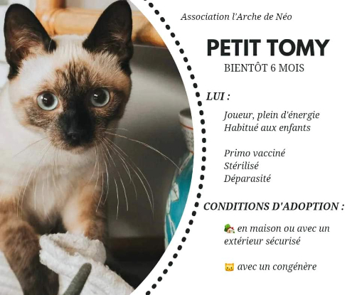 A la fois indépendant et pot de colle quand il le décide, Petit Tomy est adorable ! Toutefois malgré sa jolie frimousse, ce n'est pas une peluche ! Nous cherchons pour lui une famille quelque peu expérimentée avec les chats/chatons car il faudra pour Petit Tomy de la patience et du temps pour parfaire son éducation et lui permettre de devenir un chat équilibré ❤️