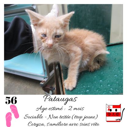 URGENCE EUTHANASIE ! Pataugas est une femelle de 2 mois sociable qui vous attend dans une fourrière du 56. ATTENTION SORTIE AU PLUS TARD LE 10/07/2020 (avant euthanasie) ! Pour adopter, c'est facile : ➡️ On se rend sur la page facebook d'Urgence Fourrière de Bretagne (UFB) -> https://www.facebook.com/sosfourrieresbreizh/ ➡️ On vient en message privé sur la page UFB ➡️ On remplit le questionnaire ➡️ Si le questionnaire est validé, on se rend disponible pour la pré-visite ➡️ On se rend aussi disponible pour venir chercher le loulou en fourrière Les chats sortent de fourrière primo-vaccinés et identifiés. Restera à charge de l’adoptant le rappel de vaccin et la stérilisation qui est OBLIGATOIRE. Les femelles en fourrière ayant été trouvées dans la rue, il y a fort à parier que nombre d'entre elles en âge de l'être soient gestantes ... ---- A PROPOS D'URGENCE FOURRIERE DE BRETAGNE (UFB) Nous sommes un COLLECTIF d'ASSOCIATIONS DE PROTECTION ANIMALE (qui rassemble notamment Moustaches et Compagnie, Bêtes de Scène, les Pachas, Chats Libres de Berné, etc, etc....) Le BUT de ce collectif d'associations est donc de SORTIR ces animaux des fourrières surchargées en les faisant ADOPTER de manière LEGALE par des familles ou en leur trouvant des FAMILLES D'ACCUEIL lorsque des places en association se libèrent.