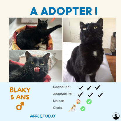 Pour Blaky nous cherchons une famille en maison avec jardin. En effet, Blaky aime bien prendre des bains de soleil et respirer l’air frais du dehors. Blaky pourra vivre avec ses congénères chats. En revanche, nous ne souhaitons pas la présence d’enfants en bas âge. Blaky aime les environnements calmes et routiniers. Enfin, Blaky est autonome en journée, mais vous réclamera quand même beaucoup d’attention pour des câlins !
