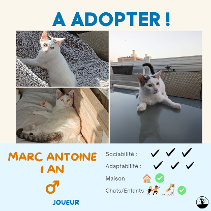 Très joueur, intelligent et curieux, il sera fier de montrer ses pirouettes pour attraper une plume ! Mais aussi très câlin, Marc Antoine réclame beaucoup de moment de tendresse et de complicité avec son humaine. Tellement sociable, le petit choux pourra être très heureux avec ses congénères chats et même les enfants !