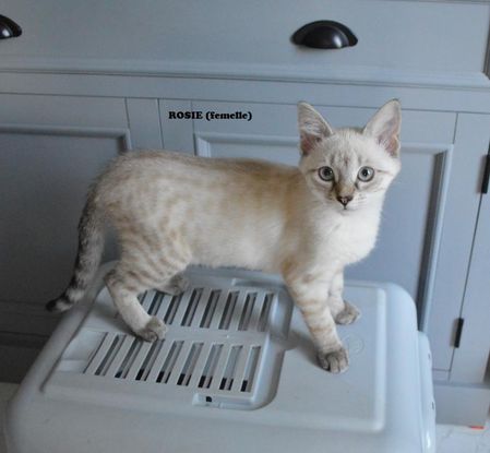 Côté caractère, ROSIE est la plus timide de la portée. Elle est encore peureuse avec les inconnus, mais la curiosité et l'envie de jouer finissent par la faire s'approcher de l'humain. Elle sait jouer sans sortir les griffes et sans mordiller trop fort. Elle est également extrêmement attirée par nos autres grands chats, qu'elle aime suivre à distance. On ne connaît pas sa réaction vis-à-vis des chiens, car il n'y en a pas chez nous.