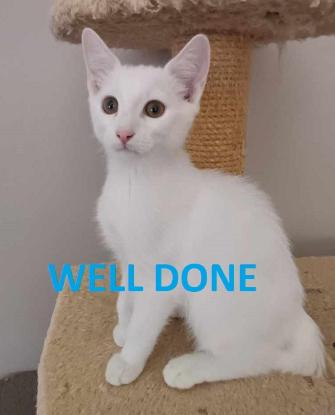 WELL DONE: Mâle blanc avec 3 poils noirs côté oreille droite. Comme Wiki, Well Done est timide mais joueur