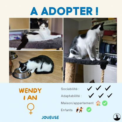 Pour Wendy nous cherchons une famille vivant en appartement avec balcon sécurisé ou maison. Elle est très heureuse en intérieur, mais apprécie tout de même prendre l’air frais et le soleil. Wendy est compatible avec les enfants (et sera même très heureuse de partager sa vie avec eux) Enfin, Wendy est autonome en journée, mais réclamera beaucoup d’attention !