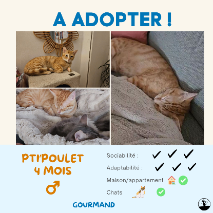 Pti’poulet est un jeune chaton de 4 mois, roux, et surtout très mignon. Pti’poulet est un chat douillé, il adore faire de longues siestes dans des coins chauds et agréables. Canapé, lit, pouf, tout y passe ! D’ailleurs Pti’poulet adore les gratouilles et les caresses quand il se love dans des plaids. Ce petit ange est aussi un grand gourmand. Il vous fera ses beaux yeux en amandes pour avoir des friandises. Et comment résister à son regard et sa jolie bouille ?