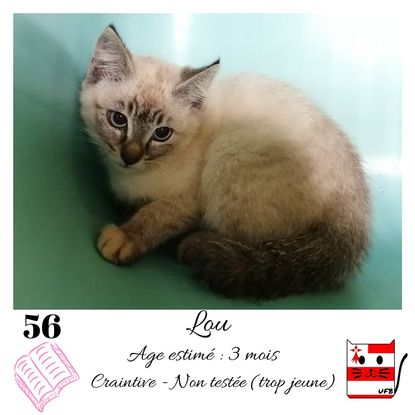 URGENCE EUTHANASIE ! Lou est une femelle de 3 mois craintive (un comportement normal en fourrière) qui vous attend dans une fourrière du 56. ATTENTION SORTIE AU PLUS TARD LE 17/07/2020 (avant euthanasie) ! Pour adopter, c'est facile : ➡️ On se rend sur la page facebook d'Urgence Fourrière de Bretagne (UFB) -> https://www.facebook.com/sosfourrieresbreizh/ ➡️ On vient en message privé sur la page UFB ➡️ On remplit le questionnaire ➡️ Si le questionnaire est validé, on se rend disponible pour la pré-visite ➡️ On se rend aussi disponible pour venir chercher le loulou en fourrière Les chats sortent de fourrière primo-vaccinés et identifiés. Restera à charge de l’adoptant le rappel de vaccin et la stérilisation qui est OBLIGATOIRE. Les femelles en fourrière ayant été trouvées dans la rue, il y a fort à parier que nombre d'entre elles en âge de l'être soient gestantes ... ---- A PROPOS D'URGENCE FOURRIERE DE BRETAGNE (UFB) Nous sommes un COLLECTIF d'ASSOCIATIONS DE PROTECTION ANIMALE (qui rassemble notamment Moustaches et Compagnie, Bêtes de Scène, les Pachas, Chats Libres de Berné, etc, etc....) Le BUT de ce collectif d'associations est donc de SORTIR ces animaux des fourrières surchargées en les faisant ADOPTER de manière LEGALE par des familles ou en leur trouvant des FAMILLES D'ACCUEIL lorsque des places en association se libèrent.