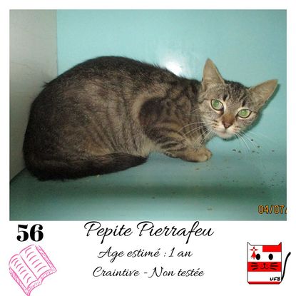 URGENCE EUTHANASIE ! Pepite Pierrafeu est une femelle de 1 an craintive (un comportement normal en fourrière) qui vous attend dans une fourrière du 56. ATTENTION SORTIE AU PLUS TARD LE 17/07/2020 (avant euthanasie) ! Pour adopter, c'est facile : ➡️ On se rend sur la page facebook d'Urgence Fourrière de Bretagne (UFB) -> https://www.facebook.com/sosfourrieresbreizh/ ➡️ On vient en message privé sur la page UFB ➡️ On remplit le questionnaire ➡️ Si le questionnaire est validé, on se rend disponible pour la pré-visite ➡️ On se rend aussi disponible pour venir chercher le loulou en fourrière Les chats sortent de fourrière primo-vaccinés et identifiés. Restera à charge de l’adoptant le rappel de vaccin et la stérilisation qui est OBLIGATOIRE. Les femelles en fourrière ayant été trouvées dans la rue, il y a fort à parier que nombre d'entre elles en âge de l'être soient gestantes ... ---- A PROPOS D'URGENCE FOURRIERE DE BRETAGNE (UFB) Nous sommes un COLLECTIF d'ASSOCIATIONS DE PROTECTION ANIMALE (qui rassemble notamment Moustaches et Compagnie, Bêtes de Scène, les Pachas, Chats Libres de Berné, etc, etc....) Le BUT de ce collectif d'associations est donc de SORTIR ces animaux des fourrières surchargées en les faisant ADOPTER de manière LEGALE par des familles ou en leur trouvant des FAMILLES D'ACCUEIL lorsque des places en association se libèrent.