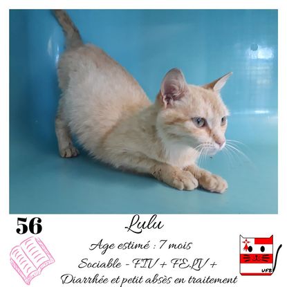 URGENCE EUTHANASIE ! Lulu est une femelle de 7 mois double positive et sociable qui vous attend dans une fourrière du 56. ATTENTION SORTIE AU PLUS TARD LE 17/07/2020 (avant euthanasie) ! Pour adopter, c'est facile : ➡️ On se rend sur la page facebook d'Urgence Fourrière de Bretagne (UFB) -> https://www.facebook.com/sosfourrieresbreizh/ ➡️ On vient en message privé sur la page UFB ➡️ On remplit le questionnaire ➡️ Si le questionnaire est validé, on se rend disponible pour la pré-visite ➡️ On se rend aussi disponible pour venir chercher le loulou en fourrière Les chats sortent de fourrière primo-vaccinés et identifiés. Restera à charge de l’adoptant le rappel de vaccin et la stérilisation qui est OBLIGATOIRE. Les femelles en fourrière ayant été trouvées dans la rue, il y a fort à parier que nombre d'entre elles en âge de l'être soient gestantes ... ---- A PROPOS D'URGENCE FOURRIERE DE BRETAGNE (UFB) Nous sommes un COLLECTIF d'ASSOCIATIONS DE PROTECTION ANIMALE (qui rassemble notamment Moustaches et Compagnie, Bêtes de Scène, les Pachas, Chats Libres de Berné, etc, etc....) Le BUT de ce collectif d'associations est donc de SORTIR ces animaux des fourrières surchargées en les faisant ADOPTER de manière LEGALE par des familles ou en leur trouvant des FAMILLES D'ACCUEIL lorsque des places en association se libèrent.