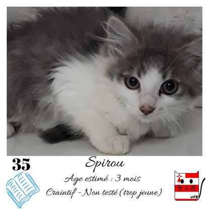 URGENCE EUTHANASIE ! Spirou est un mâle de 3 mois craintif (un comportement normal en fourrière) qui vous attend dans une fourrière du 35. ATTENTION SORTIE AU PLUS TARD LE 17/07/2020 (avant euthanasie) ! Pour adopter, c'est facile : ➡️ On se rend sur la page facebook d'Urgence Fourrière de Bretagne (UFB) -> https://www.facebook.com/sosfourrieresbreizh/ ➡️ On vient en message privé sur la page UFB ➡️ On remplit le questionnaire ➡️ Si le questionnaire est validé, on se rend disponible pour la pré-visite ➡️ On se rend aussi disponible pour venir chercher le loulou en fourrière Les chats sortent de fourrière primo-vaccinés et identifiés. Restera à charge de l’adoptant le rappel de vaccin et la stérilisation qui est OBLIGATOIRE. Les femelles en fourrière ayant été trouvées dans la rue, il y a fort à parier que nombre d'entre elles en âge de l'être soient gestantes ... ---- A PROPOS D'URGENCE FOURRIERE DE BRETAGNE (UFB) Nous sommes un COLLECTIF d'ASSOCIATIONS DE PROTECTION ANIMALE (qui rassemble notamment Moustaches et Compagnie, Bêtes de Scène, les Pachas, Chats Libres de Berné, etc, etc....) Le BUT de ce collectif d'associations est donc de SORTIR ces animaux des fourrières surchargées en les faisant ADOPTER de manière LEGALE par des familles ou en leur trouvant des FAMILLES D'ACCUEIL lorsque des places en association se libèrent.