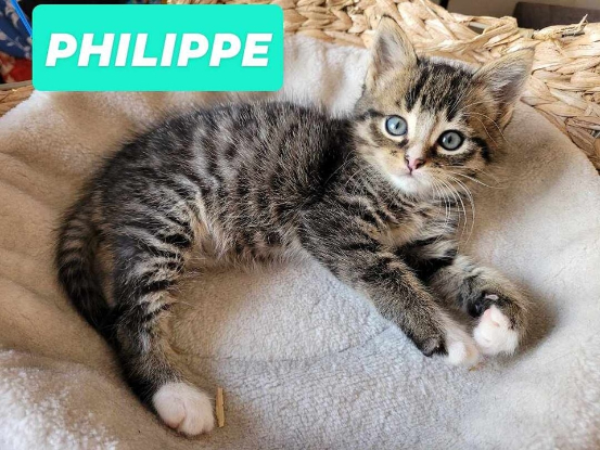 Philippe est beau, Philippe est doux, Philippe est tout petit, Philippe fait des choses trop mignonnes, mais avant tout Philippe n'a pas été sevré par sa maman. Sans maman ni présence d'autres chats les premières semaines de sa vie, Philippe n'a pas reçu les codes félins. Concrètement cela signifie qu'il a la morsure facile et ne se rend pas compte qu'il fait mal avec ses dents ou ses griffes. Il y a donc tout un apprentissage à faire pour lui et cela ne pourra se faire qu'en présence d'autres chats dans le foyer, qui doivent eux même posséder les codes félins et être suffisamment dynamiques et sociables pour interagir avec lui régulièrement.