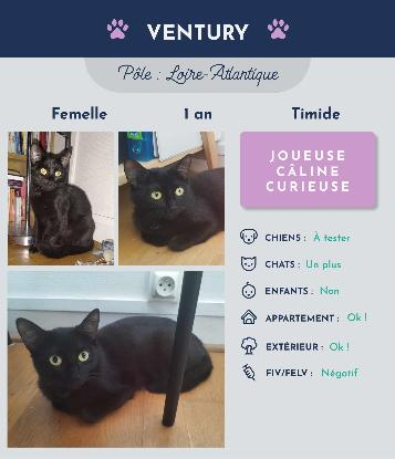 Chalut moi c'est Ventury une adorable Chatte de 1 an. Sous les airs très sérieux, je suis en fait une grande joueuse. Un compagnon le permettrait d'être plus épanouie, afin de pouvoir jouer avec et être plus détendue.