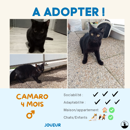 Vous cherchiez un chaton mignon et rayonnant ? Vous êtes sur le bon profil ! Camaro est un chaton joueur et rigolo. Il adore jouer avec des balles, des petites souris, des plumes. C’est un chaton plein de vie, curieux de tout ! Quand il ne joue pas, Camaro fait des siestes sur son humaine. C’est un chaton qui aime la présence des humains. Notamment pour faire des câlins !