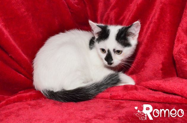 ROMEO, chaton mâle, né le 05/04/2020 Couleur : noir et blanc ROMEO est né dans la rue avec ses frères et sa sœur à Osny (95). Leur maman non sociable a été stérilisée par l’association et les personnes qui nourrissaient la famille ont bien voulu continuer de s’en occuper. ROMEO est timide de prime abord mais se révèle très joueur. ROMEO a été vermifugé, déparasité. Il est testé FIV négatif et FELV négatif, identifié et primo vacciné. Frais d'adoption 160€ Stérilisation obligatoire à 6 mois (caution demandée) En Famille d'accueil à Cergy (95). Si vous souhaitez l'adopter, contactez-nous au 06 17 40 10 22 de 9h à 20h, n'hésitez pas à laisser un message sur le répondeur (surtout PAS DE SMS, merci).