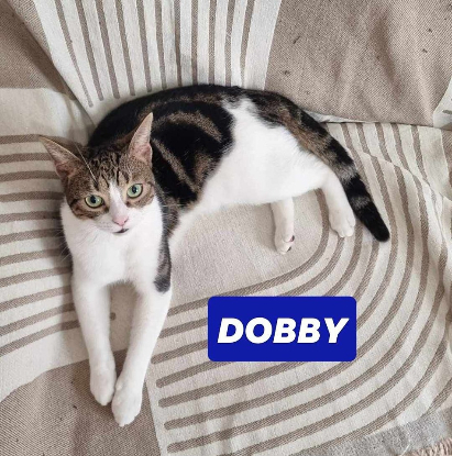 Dobby est un chat bien dans ses pattes. Il est très sociable tant avec les humains qu'avec ses autres amis à quatre pattes. C'est un chat qui a besoin de présence, car il adore suivre son humain partout pour regarder ce qu'il fait, ou récolter quelques câlins au passage. Dobby est en effet très demandeur de câlins et gratouilles en tout genre à tout moment. En somme, il est le parfait équilibre entre jeu, independance et affection, un super compagnon du quotidien !