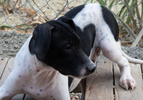 La mère est une chienne de type braque de taille moyenne et le père est probablement un Bodeguero car certains chiots portent des tâches typiques de cette race.
