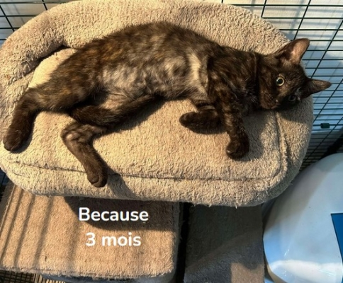 BECAUSE a été identifiée par puce électronique, vaccinée, déparasitée, il restera sa stérilisation à effectuer chez l'un de nos vétérinaires partenaires lorsqu'elle aura 5 mois.