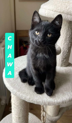 Chawa, beau mâle noir avec des poils blancs dans les oreilles. Il a aussi la robe légèrement tachetée de marron. C’est le joueur de la fratrie, toujours prêt à jouer à la bagarre avec son humain. Il est très sociable. Il aime être en hauteur et regarder par la fenêtre. Il s’habitue très vite à un nouvel environnement et ronronne facilement avec son humains. Comme ses frères et sœurs il est propre et sociable.