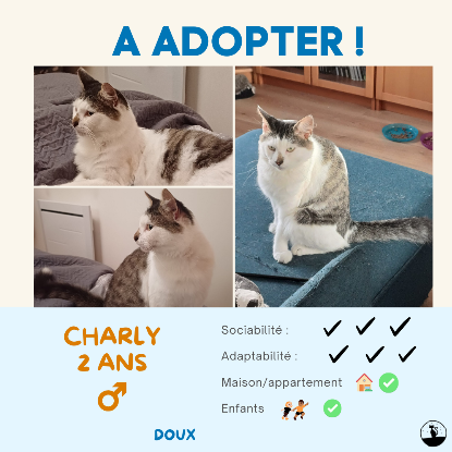 Charly est un chat adulte calme et affectueux. Le loulou aime beaucoup demander des câlins et de l’attention quand les humains sont là. Et quand il est seul à la maison, Charly fait de longues siestes. Charly est aussi un chat gourmand, et sage. Nous soupçonnons d’ailleurs Charly d’être composé à 50% de gentillesse et 50% d’amour !