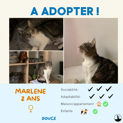 Marlène est une choupette toute sage, âgée d’environ 2 ans. Sa petite bouille fait craquer tous les humains qui la rencontre ! Elle est gentille, câline, joueuse et adore la présence des humains. Marlène est un petit chat chien qui suit son humaine partout à la maison. Elle aime beaucoup jouer, courir, sauter, attraper des mouches, jouer avec un chouchou. Voilà une minette pleine de vie, qui ne demande qu’une chose : trouver une famille aimante.