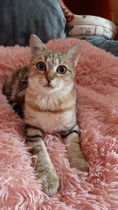 VADROUILLE est une femelle tigrée grise. Elle est joueuse et se montre sociable en se laissant caresser. Très complice avec sa soeur Volga.