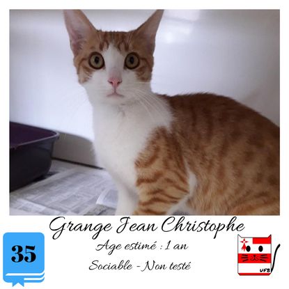 URGENCE EUTHANASIE ! Grange Jean Christophe est un mâle de 1 an sociable qui vous attend dans une fourrière du 35. ATTENTION SORTIE AU PLUS TARD LE 24/07/2020 (avant euthanasie) ! Pour adopter, c'est facile : ➡️ On se rend sur la page facebook d'Urgence Fourrière de Bretagne (UFB) -> https://www.facebook.com/sosfourrieresbreizh/ ➡️ On vient en message privé sur la page UFB ➡️ On remplit le questionnaire ➡️ Si le questionnaire est validé, on se rend disponible pour la pré-visite ➡️ On se rend aussi disponible pour venir chercher le loulou en fourrière Les chats sortent de fourrière primo-vaccinés et identifiés. Restera à charge de l’adoptant le rappel de vaccin et la stérilisation qui est OBLIGATOIRE. Les femelles en fourrière ayant été trouvées dans la rue, il y a fort à parier que nombre d'entre elles en âge de l'être soient gestantes ... ---- A PROPOS D'URGENCE FOURRIERE DE BRETAGNE (UFB) Nous sommes un COLLECTIF d'ASSOCIATIONS DE PROTECTION ANIMALE (qui rassemble notamment Moustaches et Compagnie, Bêtes de Scène, les Pachas, Chats Libres de Berné, etc, etc....) Le BUT de ce collectif d'associations est donc de SORTIR ces animaux des fourrières surchargées en les faisant ADOPTER de manière LEGALE par des familles ou en leur trouvant des FAMILLES D'ACCUEIL lorsque des places en association se libèrent.