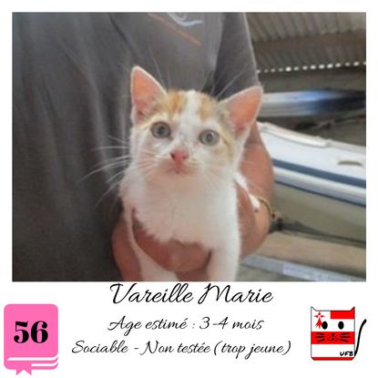 URGENCE EUTHANASIE ! Vareille Marie est une femelle de 3-4 mois sociable qui vous attend dans une fourrière du 56. ATTENTION SORTIE AU PLUS TARD LE 24/07/2020 (avant euthanasie) ! Pour adopter, c'est facile : ➡️ On se rend sur la page facebook d'Urgence Fourrière de Bretagne (UFB) -> https://www.facebook.com/sosfourrieresbreizh/ ➡️ On vient en message privé sur la page UFB ➡️ On remplit le questionnaire ➡️ Si le questionnaire est validé, on se rend disponible pour la pré-visite ➡️ On se rend aussi disponible pour venir chercher le loulou en fourrière Les chats sortent de fourrière primo-vaccinés et identifiés. Restera à charge de l’adoptant le rappel de vaccin et la stérilisation qui est OBLIGATOIRE. Les femelles en fourrière ayant été trouvées dans la rue, il y a fort à parier que nombre d'entre elles en âge de l'être soient gestantes ... ---- A PROPOS D'URGENCE FOURRIERE DE BRETAGNE (UFB) Nous sommes un COLLECTIF d'ASSOCIATIONS DE PROTECTION ANIMALE (qui rassemble notamment Moustaches et Compagnie, Bêtes de Scène, les Pachas, Chats Libres de Berné, etc, etc....) Le BUT de ce collectif d'associations est donc de SORTIR ces animaux des fourrières surchargées en les faisant ADOPTER de manière LEGALE par des familles ou en leur trouvant des FAMILLES D'ACCUEIL lorsque des places en association se libèrent.
