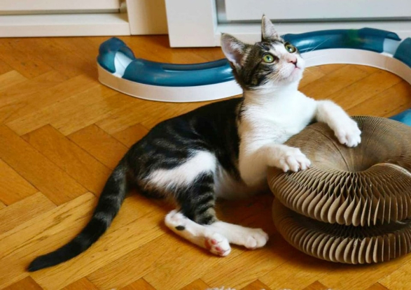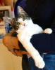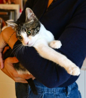 Je suis un chaton tigré gris, noir et blanc avec des yeux verts et une tache sous le nez. Je suis très joueur et dynamique et en même temps très mignon et câlin avec mes Humains. Je ne m’entends pas avec tous les chats car je veux trop jouer avec eux et ce n’est pas tout le temps réciproque. Je suis aussi propre, je ronronne tout le temps et j’ai un miaulement de fumeur longue durée. J’avais été abandonné au bord de la route avec d’autres chatons à la naissance, avec presque aucune chance de survie. On m’a donc récupéré et mis en règle afin de me donner une chance d’être adopté dans un foyer aimant.