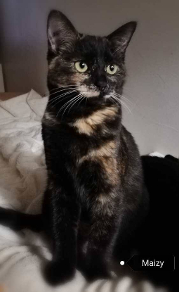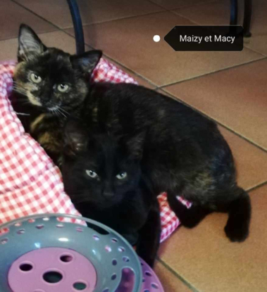 Maizy petite minette timide mais en progression constante, aime les gratouilles sur le ventre, dormir au pieds de son humain. Joueuse et gourmande. La présence de sa sœur la rassure.