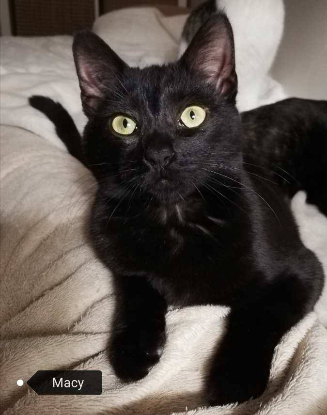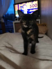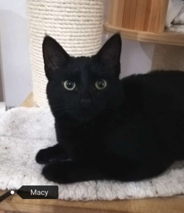 Macy, petite minette curieuse. Encore un peu timide, aime les câlins. Très gourmande. Forme un duo avec sa soeur.