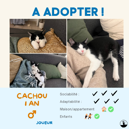 Le petit Cachou est un chaton rigolo, excessivement affectueux, mais aussi gourmand. Il nous fait fondre d’amour avec sa jolie bouille, et sa tendance à poser comme une star devant la caméra ! Cachou c’est donc le chaton parfait pour mettre de la bonne humeur dans la maison. Il adore jouer seul, ou avec ses humains. Il est aussi le spécialiste pour choisir les meilleures coins douillets pour faire ses siestes. Cachou a aussi un bout d’oreille couper, nous pensons que cela a été fait volontairement par des humains. Heureusement, Cachou n’a aucune rancune envers les humains, au contraire il offre sa confiance aveuglement à qui veut bien lui donner de l’amour !