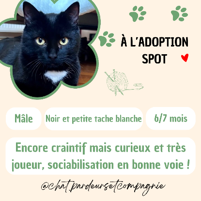 Spot est un petit minou d'environ 6 / 7 mois, né dehors dans le quartier Mistral à Grenoble, avec deux frères et/ou sœurs, mais l'un d'entre eux n'a jamais été retrouvé... ?