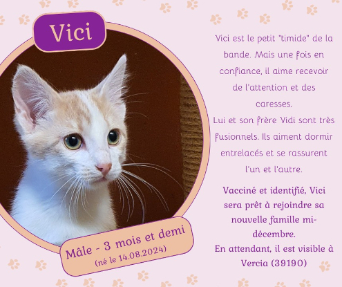 Nous contacter par Messenger « Gaspard & Luna » ou par mail [email protected] pour l’adopter en indiquant « VICI »