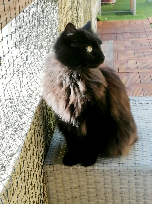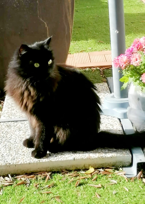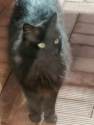 Shym est une chatte de type européenne non LOF noire à poils longs, issue de mère inconnue (abandon). Stérilisée et identifiée par tatouage 303LOP via Chats vagabonds