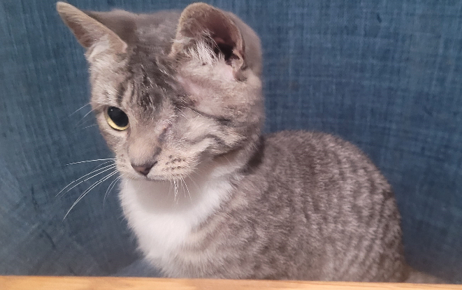 Yellie a été recueillie par la fourrière et déposée aux urgences vétérinaires pour une énucléation causée par un ulcère. Elle souffrait également d'un coryza. La vie à la rue pour les animaux est une rude épreuve surtout quand on est un bébé chat de 800 g. Nous avons pris en charge cette chatonne d'à peine 2 mois au sein de notre association.