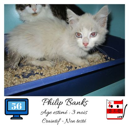 URGENCE EUTHANASIE ! Philip Banks est un mâle de 3 mois craintif (un comportement tout à fait normal en fourrière) qui vous attend dans une fourrière du 56. ATTENTION SORTIE AU PLUS TARD LE 31/07/2020 (avant euthanasie) ! Pour adopter, c'est facile : ➡️ On se rend sur la page facebook d'Urgence Fourrière de Bretagne (UFB) -> https://www.facebook.com/sosfourrieresbreizh/ ➡️ On vient en message privé sur la page UFB ➡️ On remplit le questionnaire ➡️ Si le questionnaire est validé, on se rend disponible pour la pré-visite ➡️ On se rend aussi disponible pour venir chercher le loulou en fourrière Les chats sortent de fourrière primo-vaccinés et identifiés. Restera à charge de l’adoptant le rappel de vaccin et la stérilisation qui est OBLIGATOIRE. Les femelles en fourrière ayant été trouvées dans la rue, il y a fort à parier que nombre d'entre elles en âge de l'être soient gestantes ... ---- A PROPOS D'URGENCE FOURRIERE DE BRETAGNE (UFB) Nous sommes un COLLECTIF d'ASSOCIATIONS DE PROTECTION ANIMALE (qui rassemble notamment Moustaches et Compagnie, Bêtes de Scène, les Pachas, Chats Libres de Berné, etc, etc....) Le BUT de ce collectif d'associations est donc de SORTIR ces animaux des fourrières surchargées en les faisant ADOPTER de manière LEGALE par des familles ou en leur trouvant des FAMILLES D'ACCUEIL lorsque des places en association se libèrent.
