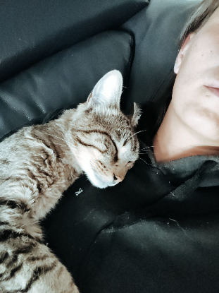??? Simbah est un jeune chat qui s'est retrouvé chez nous après avoir vécu dans une pièce sans sorties possibles pendant 1 an et demi. Il a connu une grande famille par la suite, qu'il a lui même choisi, avec des copains chats chiens et enfants, mais ne trouve plus sa place au milieu de tout ce monde.