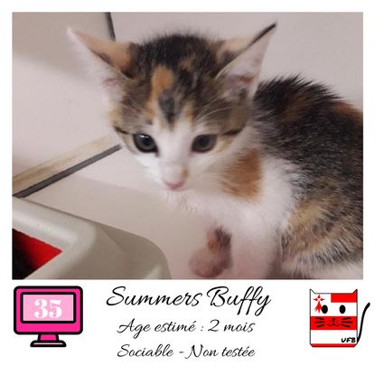 URGENCE EUTHANASIE ! Summers Buffy est une femelle de 2 mois sociable qui vous attend dans une fourrière du 35. ATTENTION SORTIE AU PLUS TARD LE 31/07/2020 (avant euthanasie) ! Pour adopter, c'est facile : ➡️ On se rend sur la page facebook d'Urgence Fourrière de Bretagne (UFB) -> https://www.facebook.com/sosfourrieresbreizh/ ➡️ On vient en message privé sur la page UFB ➡️ On remplit le questionnaire ➡️ Si le questionnaire est validé, on se rend disponible pour la pré-visite ➡️ On se rend aussi disponible pour venir chercher le loulou en fourrière Les chats sortent de fourrière primo-vaccinés et identifiés. Restera à charge de l’adoptant le rappel de vaccin et la stérilisation qui est OBLIGATOIRE. Les femelles en fourrière ayant été trouvées dans la rue, il y a fort à parier que nombre d'entre elles en âge de l'être soient gestantes ... ---- A PROPOS D'URGENCE FOURRIERE DE BRETAGNE (UFB) Nous sommes un COLLECTIF d'ASSOCIATIONS DE PROTECTION ANIMALE (qui rassemble notamment Moustaches et Compagnie, Bêtes de Scène, les Pachas, Chats Libres de Berné, etc, etc....) Le BUT de ce collectif d'associations est donc de SORTIR ces animaux des fourrières surchargées en les faisant ADOPTER de manière LEGALE par des familles ou en leur trouvant des FAMILLES D'ACCUEIL lorsque des places en association se libèrent.