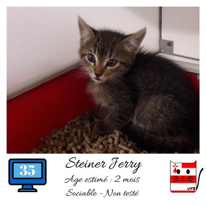 URGENCE EUTHANASIE ! Steiner Jerry est un mâle de 2 mois sociable qui vous attend dans une fourrière du 35. ATTENTION SORTIE AU PLUS TARD LE 31/07/2020 (avant euthanasie) ! Pour adopter, c'est facile : ➡️ On se rend sur la page facebook d'Urgence Fourrière de Bretagne (UFB) -> https://www.facebook.com/sosfourrieresbreizh/ ➡️ On vient en message privé sur la page UFB ➡️ On remplit le questionnaire ➡️ Si le questionnaire est validé, on se rend disponible pour la pré-visite ➡️ On se rend aussi disponible pour venir chercher le loulou en fourrière Les chats sortent de fourrière primo-vaccinés et identifiés. Restera à charge de l’adoptant le rappel de vaccin et la stérilisation qui est OBLIGATOIRE. Les femelles en fourrière ayant été trouvées dans la rue, il y a fort à parier que nombre d'entre elles en âge de l'être soient gestantes ... ---- A PROPOS D'URGENCE FOURRIERE DE BRETAGNE (UFB) Nous sommes un COLLECTIF d'ASSOCIATIONS DE PROTECTION ANIMALE (qui rassemble notamment Moustaches et Compagnie, Bêtes de Scène, les Pachas, Chats Libres de Berné, etc, etc....) Le BUT de ce collectif d'associations est donc de SORTIR ces animaux des fourrières surchargées en les faisant ADOPTER de manière LEGALE par des familles ou en leur trouvant des FAMILLES D'ACCUEIL lorsque des places en association se libèrent.