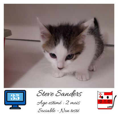 URGENCE EUTHANASIE ! Steve Sanders est un mâle de 2 mois sociable qui vous attend dans une fourrière du 35. ATTENTION SORTIE AU PLUS TARD LE 31/07/2020 (avant euthanasie) ! Pour adopter, c'est facile : ➡️ On se rend sur la page facebook d'Urgence Fourrière de Bretagne (UFB) -> https://www.facebook.com/sosfourrieresbreizh/ ➡️ On vient en message privé sur la page UFB ➡️ On remplit le questionnaire ➡️ Si le questionnaire est validé, on se rend disponible pour la pré-visite ➡️ On se rend aussi disponible pour venir chercher le loulou en fourrière Les chats sortent de fourrière primo-vaccinés et identifiés. Restera à charge de l’adoptant le rappel de vaccin et la stérilisation qui est OBLIGATOIRE. Les femelles en fourrière ayant été trouvées dans la rue, il y a fort à parier que nombre d'entre elles en âge de l'être soient gestantes ... ---- A PROPOS D'URGENCE FOURRIERE DE BRETAGNE (UFB) Nous sommes un COLLECTIF d'ASSOCIATIONS DE PROTECTION ANIMALE (qui rassemble notamment Moustaches et Compagnie, Bêtes de Scène, les Pachas, Chats Libres de Berné, etc, etc....) Le BUT de ce collectif d'associations est donc de SORTIR ces animaux des fourrières surchargées en les faisant ADOPTER de manière LEGALE par des familles ou en leur trouvant des FAMILLES D'ACCUEIL lorsque des places en association se libèrent.