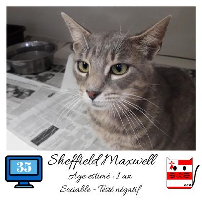 URGENCE EUTHANASIE ! Sheffield Maxwell est un mâle de 1 an sociable qui vous attend dans une fourrière du 35. ATTENTION SORTIE AU PLUS TARD LE 31/07/2020 (avant euthanasie) ! Pour adopter, c'est facile : ➡️ On se rend sur la page facebook d'Urgence Fourrière de Bretagne (UFB) -> https://www.facebook.com/sosfourrieresbreizh/ ➡️ On vient en message privé sur la page UFB ➡️ On remplit le questionnaire ➡️ Si le questionnaire est validé, on se rend disponible pour la pré-visite ➡️ On se rend aussi disponible pour venir chercher le loulou en fourrière Les chats sortent de fourrière primo-vaccinés et identifiés. Restera à charge de l’adoptant le rappel de vaccin et la stérilisation qui est OBLIGATOIRE. Les femelles en fourrière ayant été trouvées dans la rue, il y a fort à parier que nombre d'entre elles en âge de l'être soient gestantes ... ---- A PROPOS D'URGENCE FOURRIERE DE BRETAGNE (UFB) Nous sommes un COLLECTIF d'ASSOCIATIONS DE PROTECTION ANIMALE (qui rassemble notamment Moustaches et Compagnie, Bêtes de Scène, les Pachas, Chats Libres de Berné, etc, etc....) Le BUT de ce collectif d'associations est donc de SORTIR ces animaux des fourrières surchargées en les faisant ADOPTER de manière LEGALE par des familles ou en leur trouvant des FAMILLES D'ACCUEIL lorsque des places en association se libèrent.