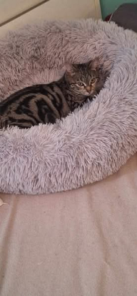 Vicky (née vers le 15 août) jeune chatte artistiquement tigrée encore très craintive, cherche une famille prête à s' investir pour l' apprivoiser en douceur avec patience et amour. Elle accepte timidement les caresses et s'intéresse peu à peu aux jeux. Un extérieur serait préférable.