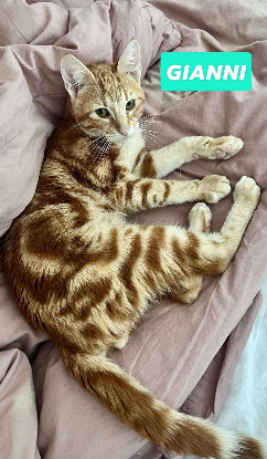 Gianni est un chat au pelage roux, doux et soyeux, orné de magnifiques tigrures qui lui donnent l'apparence d'un petit tigre.