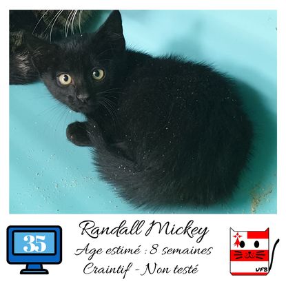 URGENCE EUTHANASIE ! Randall Mickey est un mâle de 2 mois craintif (un comportement normal en fourrière) qui vous attend dans une fourrière du 35. ATTENTION SORTIE AU PLUS TARD LE 31/07/2020 (avant euthanasie) ! Pour adopter, c'est facile : ➡️ On se rend sur la page facebook d'Urgence Fourrière de Bretagne (UFB) -> https://www.facebook.com/sosfourrieresbreizh/ ➡️ On vient en message privé sur la page UFB ➡️ On remplit le questionnaire ➡️ Si le questionnaire est validé, on se rend disponible pour la pré-visite ➡️ On se rend aussi disponible pour venir chercher le loulou en fourrière Les chats sortent de fourrière primo-vaccinés et identifiés. Restera à charge de l’adoptant le rappel de vaccin et la stérilisation qui est OBLIGATOIRE. Les femelles en fourrière ayant été trouvées dans la rue, il y a fort à parier que nombre d'entre elles en âge de l'être soient gestantes ... ---- A PROPOS D'URGENCE FOURRIERE DE BRETAGNE (UFB) Nous sommes un COLLECTIF d'ASSOCIATIONS DE PROTECTION ANIMALE (qui rassemble notamment Moustaches et Compagnie, Bêtes de Scène, les Pachas, Chats Libres de Berné, etc, etc....) Le BUT de ce collectif d'associations est donc de SORTIR ces animaux des fourrières surchargées en les faisant ADOPTER de manière LEGALE par des familles ou en leur trouvant des FAMILLES D'ACCUEIL lorsque des places en association se libèrent.