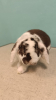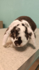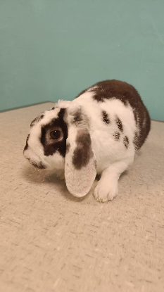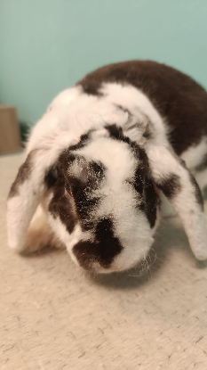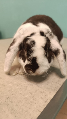 Tiramisu est un lapin Nain Bélier Rex, couleur Chocolat/Blanc, stérilisé, vermifugé, vacciné