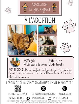 Kaly est une chatte calme et câline de 12 ans, qui aime avoir de l’attention et de l'affection. Elle n’hésite pas à réclamer des gratouilles et à se blottir auprès de vous ! La nuit, elle se cale auprès de l’oreiller et vous berce en ronronnant.