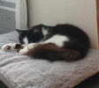Depuis mon arrivée dans ma famille d'accueil, j'ai pris l'habitude de venir m'installer sur les genoux dès que quelqu'un s'assoit, pour ronronner et demander des caresses.