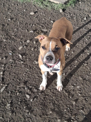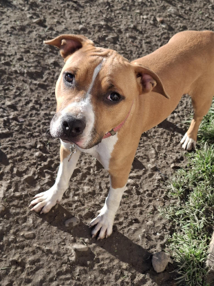 Elle est sociable avec ses congénères et les chats. En ce qui concerne les enfants, elle les aime mais est très brutos de part son jeune âge. Une famille sans enfants en bas âge sera préférable.